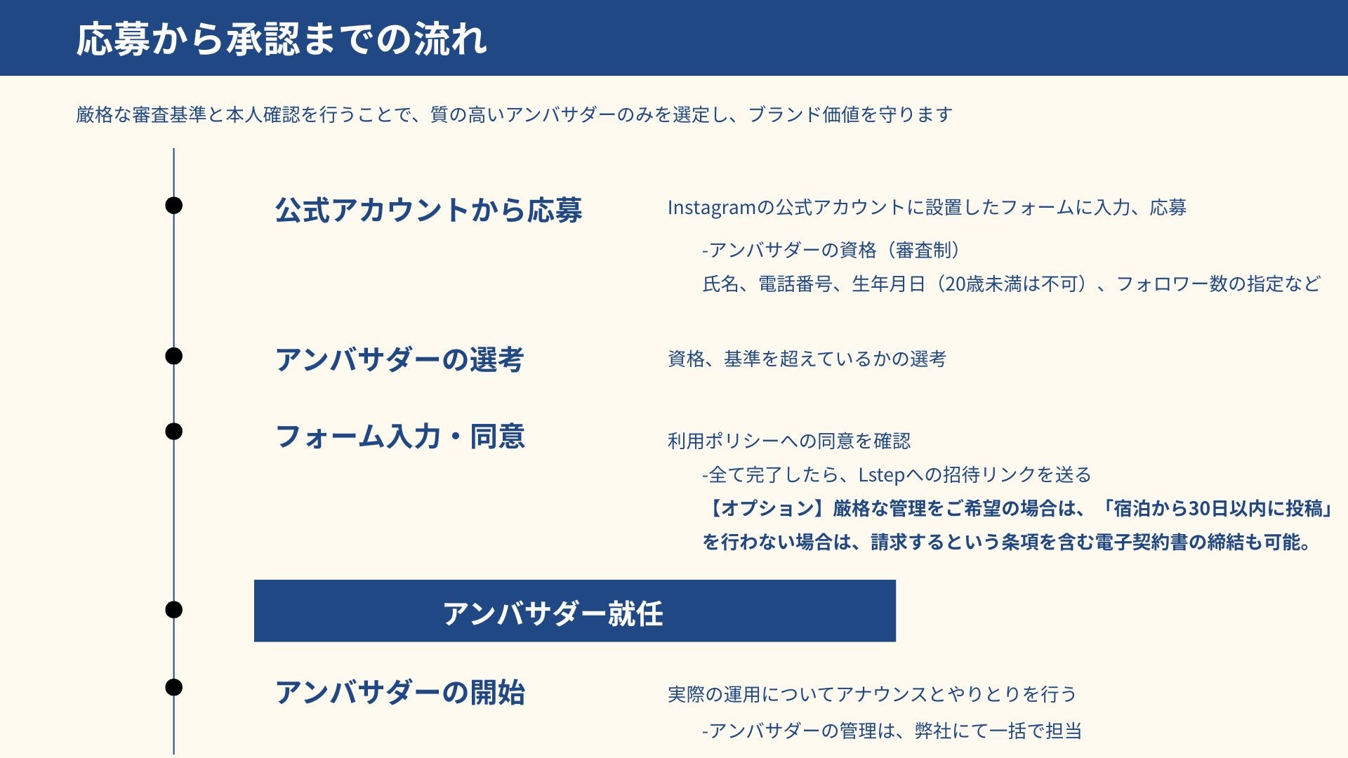 厳格な審査基準と本人確認を行うことで、質の高いアンバサダーのみを選定し、ブランド価値を守ります